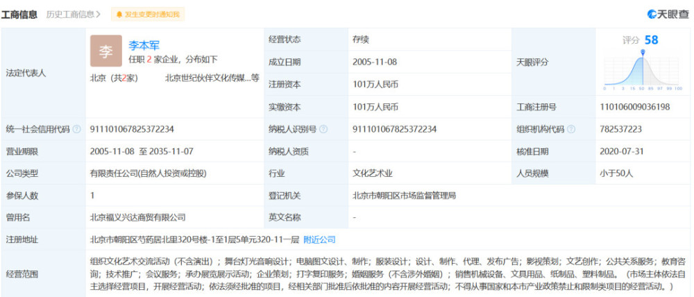 2020年4月29日,「北京文化」以4800万的低价,将世纪伙伴出售给北京福义兴达文化发展有限公司(下称“福义兴达”)。这个价格,还不到六年前「北京文化」收购世纪伙伴的4%(13.5亿)。天眼查显示,福义兴达仅为注册资本101万的小微企业,参保人数为1。
