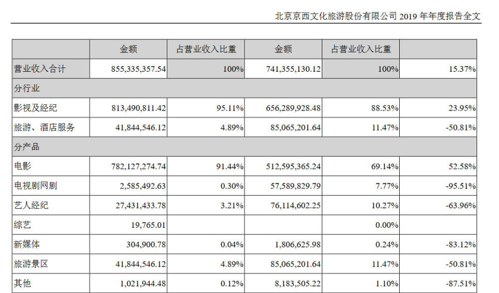 这一年,「北京文化」在电影上赚的盆满钵满,但世纪伙伴却接连吃亏。2019年「北京文化」公告显示,「北京文化」的电影收入同比增加52.58%,电视剧网剧营业却同比降落95.51%。