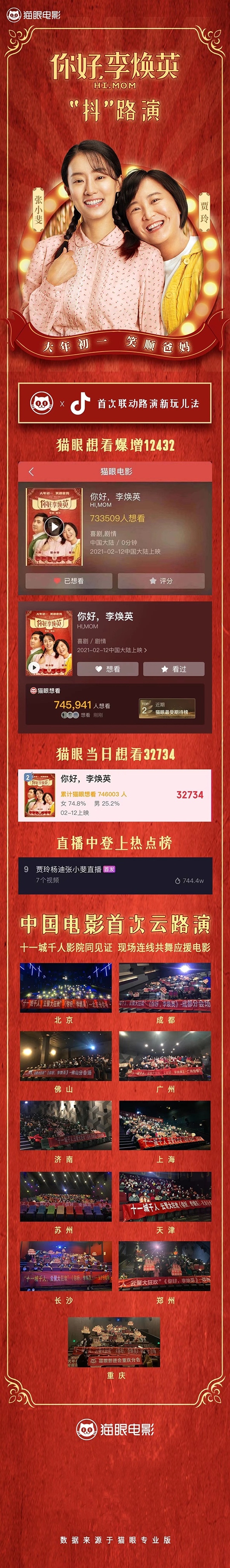 云路演当晚,猫眼邀请了北京、广州、成都等11个城市的观众走进电影院,通过银幕观看云路演现场情况,让观众设身处地,更有现场参与的仪式感。同时云路演活动还在抖音进行线上直播,活动上线仅一分钟,抖音实时在线观看人数就突破了一万人。随后,在云路演活动的80分钟里,《你好,李焕英》官方抖音号涨粉10w+,共计156.7万人次观看了云路演,累计收获3.7万条评论, 125.3万点赞,猫眼想看爆增12432,猫眼当日想看数据达到32734,截至当天总想看数达745941,可谓是成果丰厚。