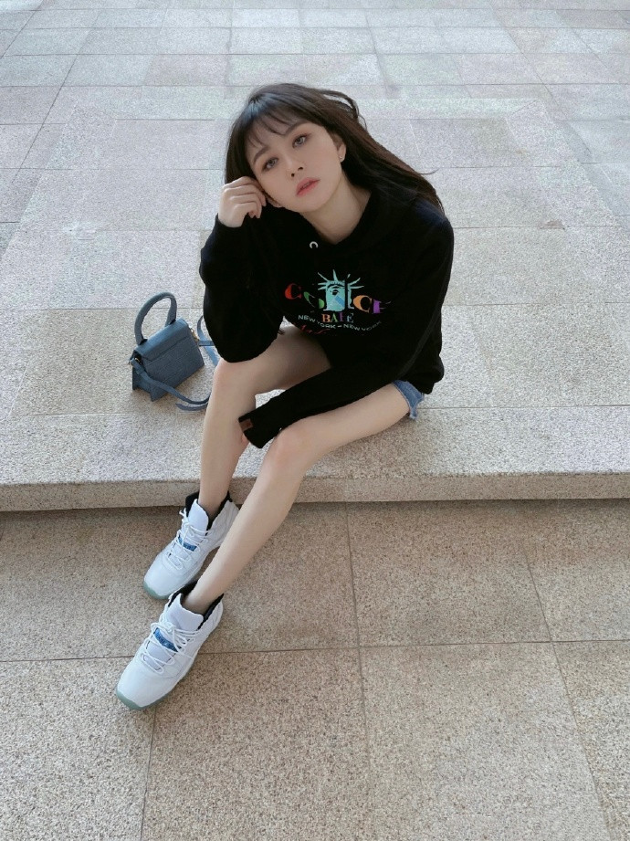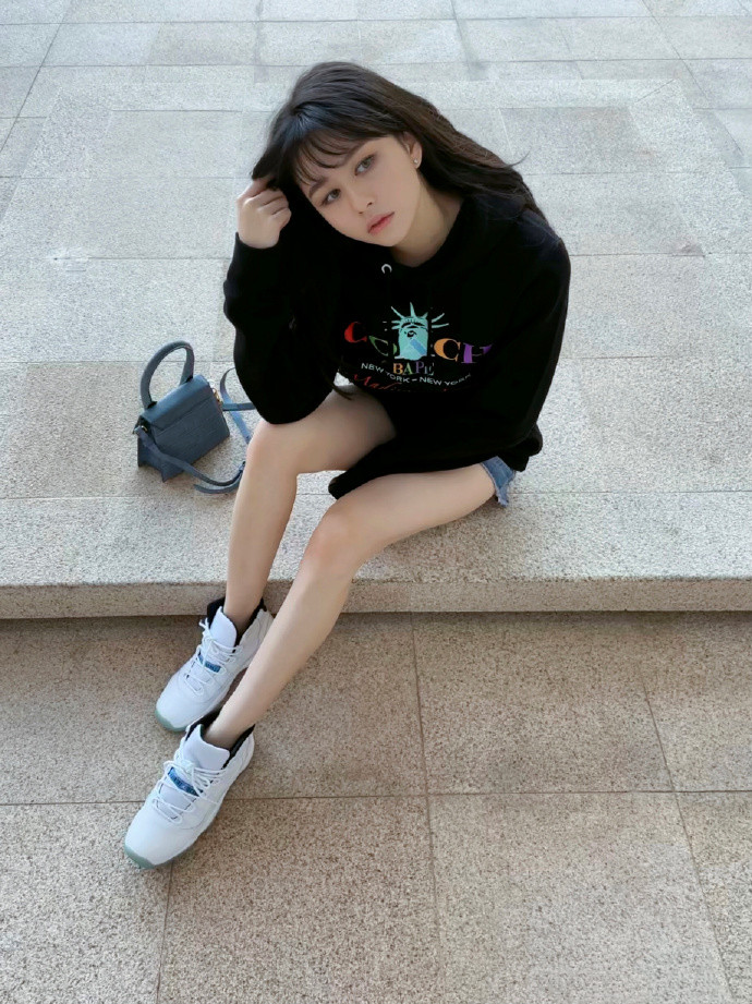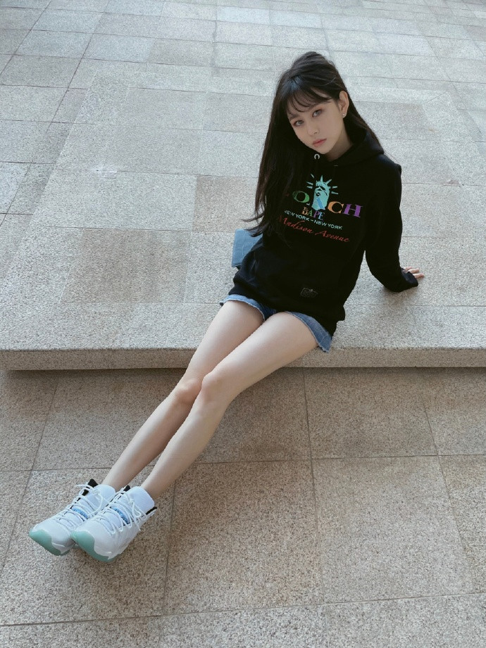 照片中,沈月披着一头齐刘海长发,身穿黑色卫衣配短裤,脚踩休闲鞋,俯拍视角下的她单手托腮凹造型,又美又略带性感范儿,养眼十足。