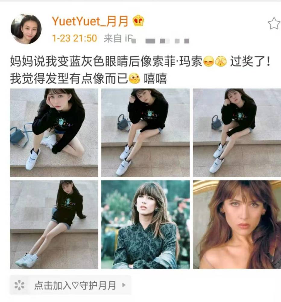 1月23日晚,邱淑贞大女儿沈月在个人社交平台分享了一组随拍美照,还罕见发文提到了妈妈,她写道:“妈妈说我变蓝灰色眼睛后像索菲·玛索,过奖了!”,而她则心花怒放地称“我觉得发型有点像而已,嘻嘻”,言语里满是欢喜。不能不说,邱淑贞真是太会夸啦。