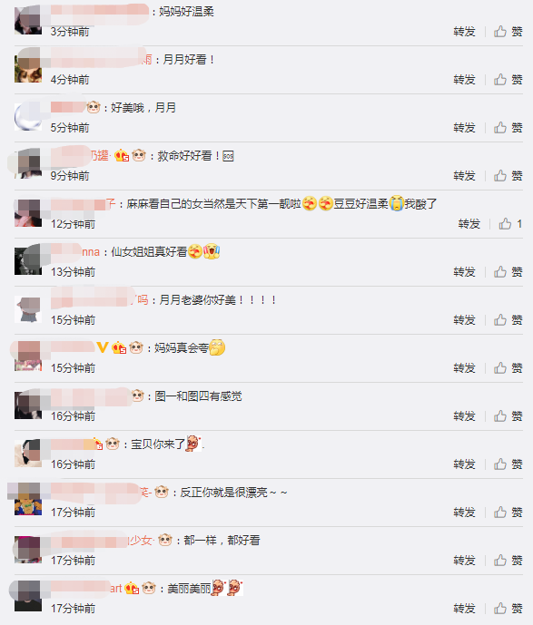 看到沈月的发文和晒照后,网友纷纷转发留言:“麻麻看自己的女当然是天下第一靓啦,豆豆好温柔我酸了”、“妈妈真会夸,反正你就是很漂亮~~”、“妈妈好温柔,月月好看!”。