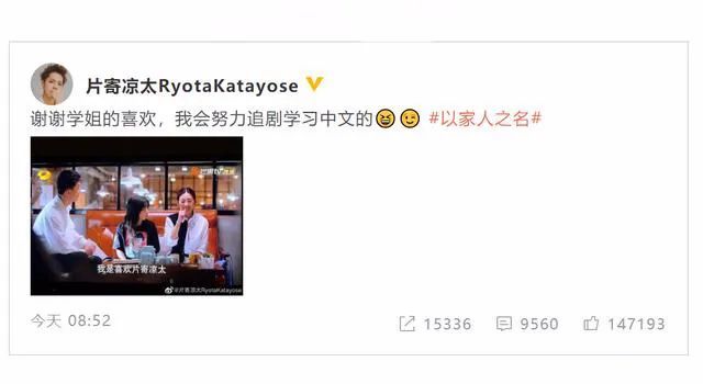没想到,片寄凉太本人在社交平台上迅速做出了回应,并且表示“谢谢学姐的喜欢,我会努力追剧学习中文的”,发文后面还@以家人之名。