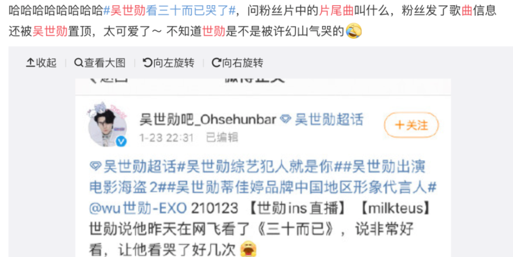 直播中,吴世勋感叹《三十而已》非常好看。甚至用了“疯狂在追”四个字形容自己的看剧状态,可见是真的很喜欢此剧。