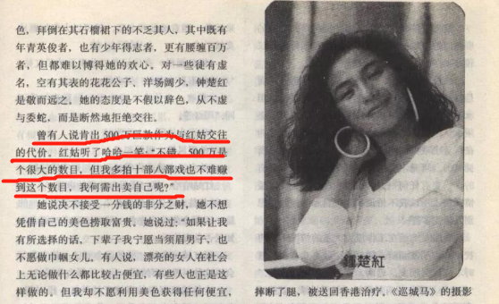 钟楚红是这么回的:“500万是很大的数目,但我多拍十部八部戏也不难赚到这个数目,何需出卖自己呢?”