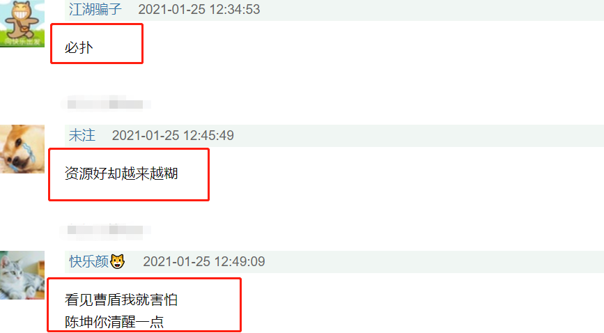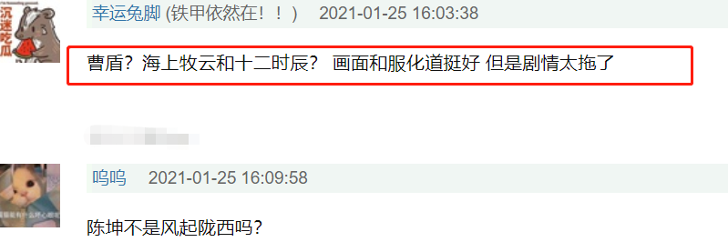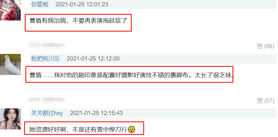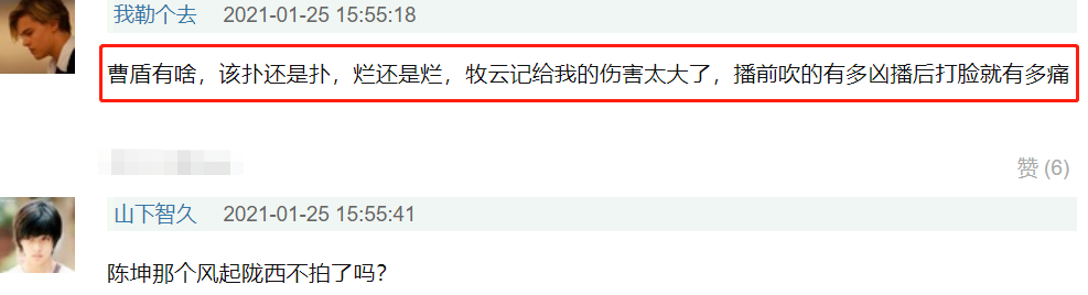 “必扑”“资源好却越来越糊”“看见曹盾我就害怕,陈坤你清醒一点”“曹盾有啥,该扑还是扑,烂还是烂,牧云记给我的伤害太大了”“曹盾?海上牧云和十二时辰?画面和服化道挺好,但是剧情太拖了”“曹盾不成”。