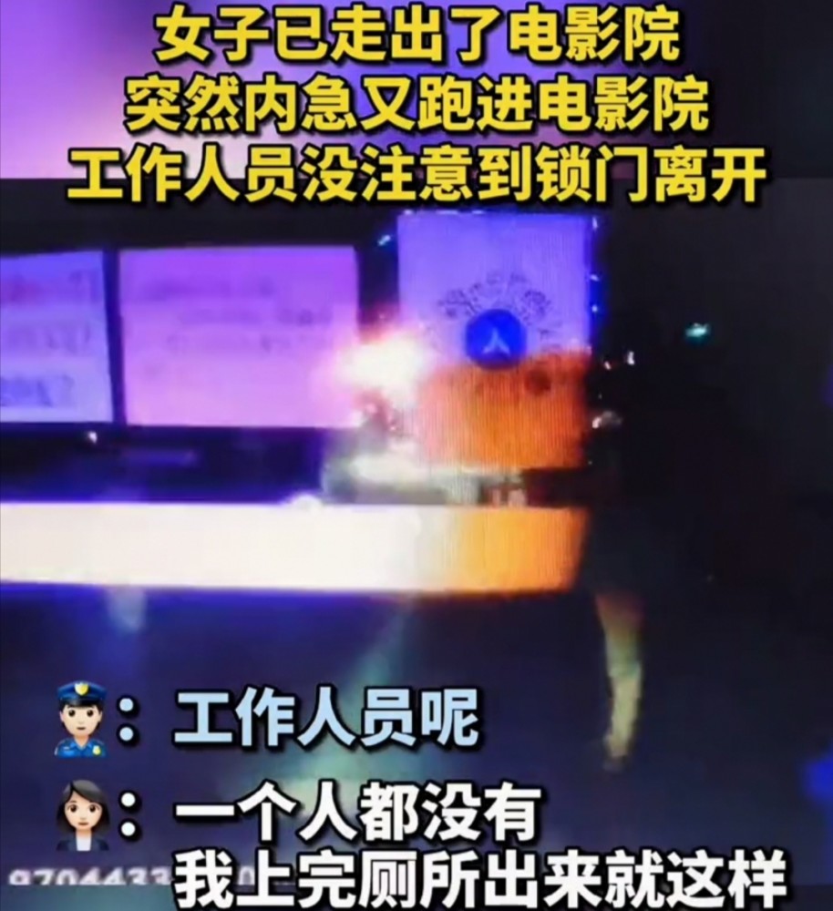 可是让小曾没有想到的是,她上完厕所竟然出不来了,电影院的工作人员都走了,大门也已经被锁了。在电影院里面叫了半天都没有人管后,小曾就给工作人员打了电话,但电话铃声却在不远处的服务台响起了,听到服务台的电话铃声以后,小曾真的是有点着急了,但她却依然没有办法出去,所以只能报警求助。