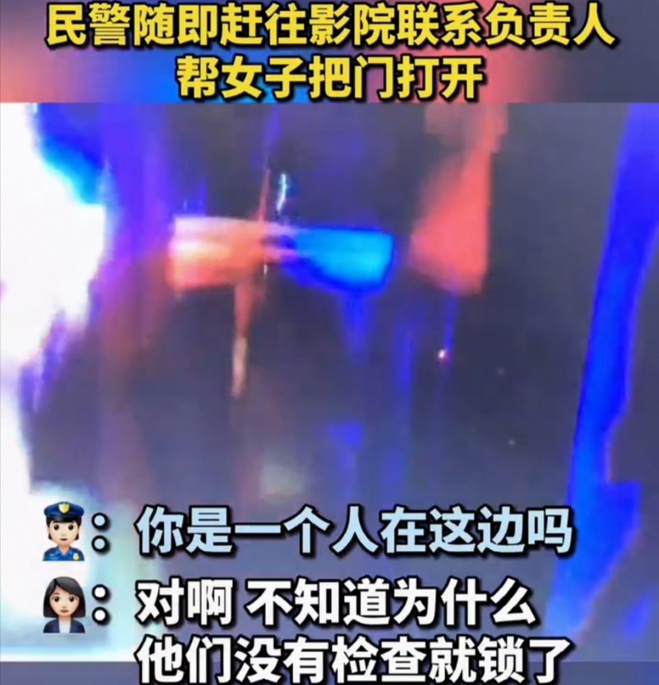 小曾拨打110后,用颤抖的声音说出了自己的遭遇,并且她周边几乎一片漆黑,安静的可怕。接到报警后,时间不长就有民警来到了电影院,民警跟小曾了解情况后,经过多方联系,终于联系到了电影院的负责人,随后电影院负责人赶到了现场,将门打开,小曾才能从里面出来。而小曾出来后,立刻感谢民警以及影院负责人的帮助。