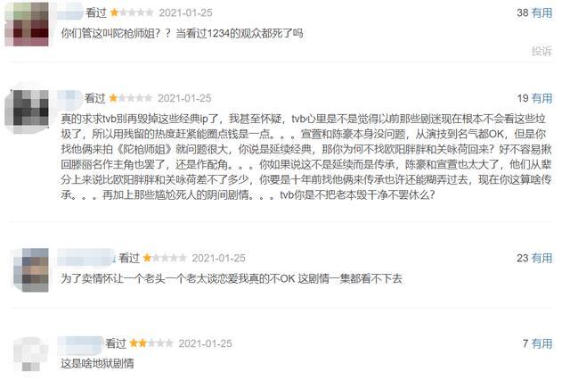 有网友在看了几集以后就不由得吐槽这部剧是“地狱剧情”、“阴间剧情”,更有网友们直言“管这叫陀枪师姐?”,“你当看过1234的观众都死了吗?”