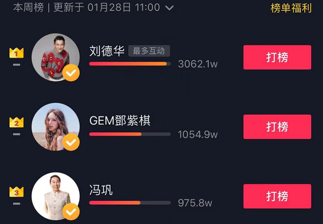 直到社交平台进行宣传以后,刘德华的视频才引起了广泛的关注,各大明星纷纷前来祝贺。刘德华一举成为本周明星榜的榜首,比第二名的邓紫棋人气高出2000万。
