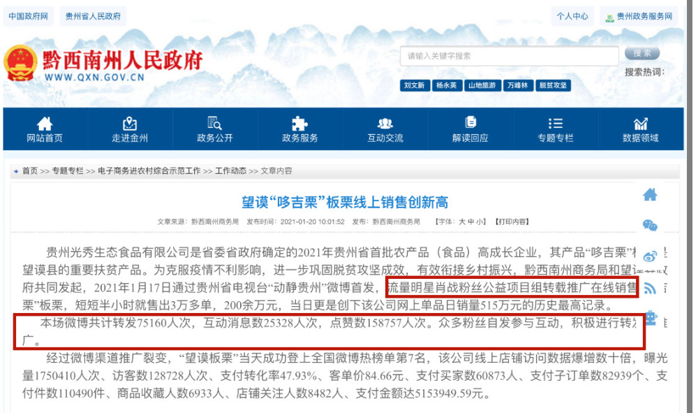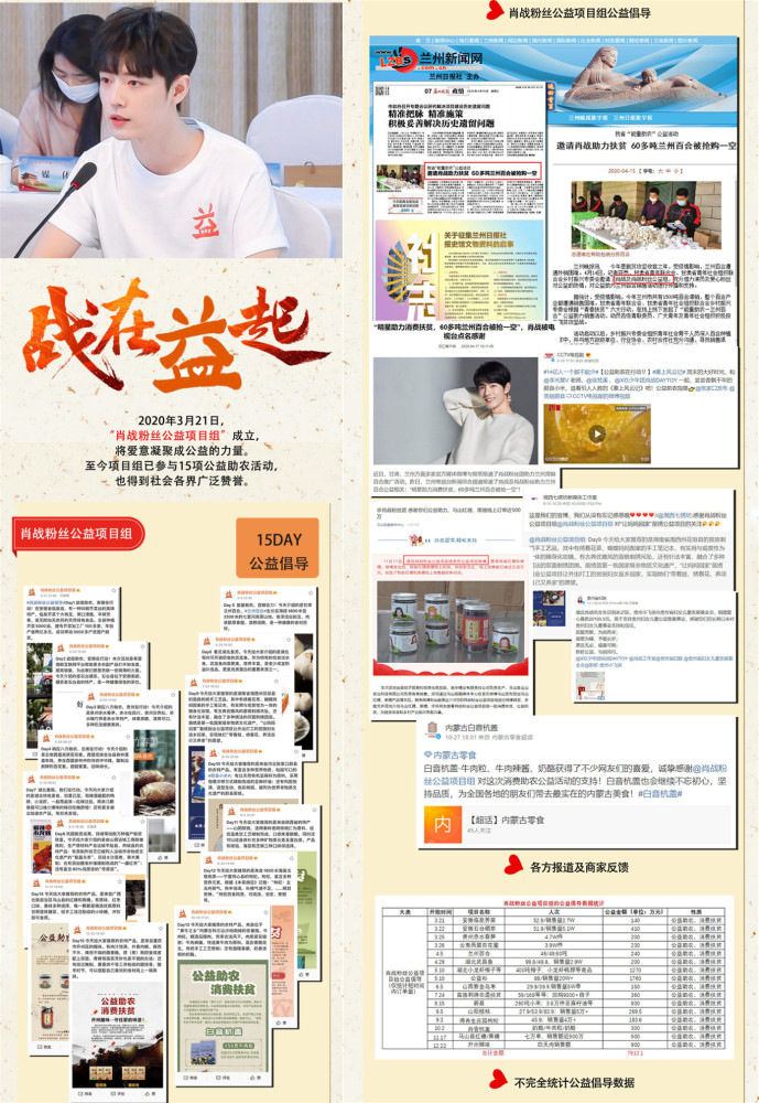 现在这个金额又涨了,前段时间肖战粉丝公益组发起的公益助农的扶贫产物贵州黔西南州的板栗,上线单日就破500万的销售额,直接创下了这款产物销量之最,不但登上了当地的纸媒上报道,感谢肖战粉丝,当地的群众政府官网公示了这次的成果,肯定了肖战粉丝的公益举措,这超1亿的公益金额,是每个粉丝真金白银的在反馈社会。