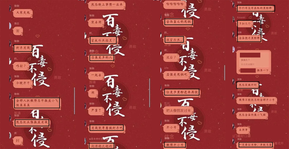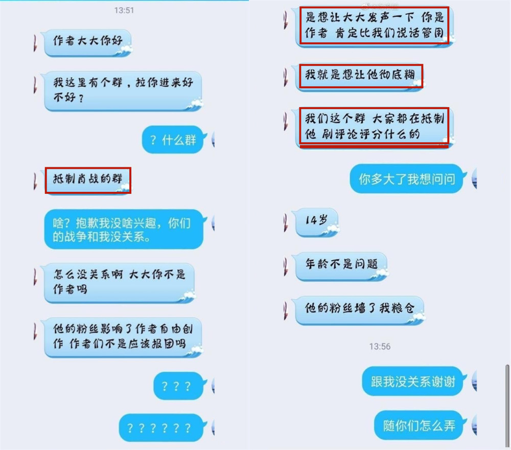 这些报酬了准备,又开始提前预热,联系业内的写手加入进来,以及如何伪装成肖战的粉丝,换头像换用户名,去举报这位作者,然后栽赃给肖战的粉丝,聊天记录被潜伏在粉丝群里的人发现,并且截图让网友们注意,有些苍蝇会故意地扯皮闹事,是会去各个圈子里闹。