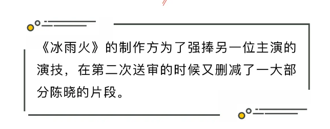 近日有网友爆料称《冰雨火》的制作方为了强捧另一名主演的演技,在第二次送审的时候又删减了一大部分陈晓的片段,消息一出随即引发网友热议。