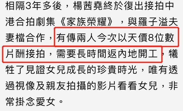 然而来内地拍戏的杨怡夫妇却要跟女儿分开许久,不行亲眼见证女儿的成长,这对两人来说都会是遗憾吧,但是能够赚取八位数的片酬,也是为女儿攒的奶粉钱了。