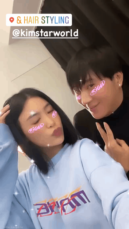 她拍照时一直的抚摸自己的头发,看起来很是不好意思,旁边的神秘男则凑过来,对着镜头比耶,眼神中都有藏不住的笑意。