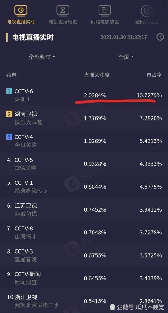 今天,电影《诛仙》在CCTV6播放,刚播出收视率就直线上升,实时播放破二。
