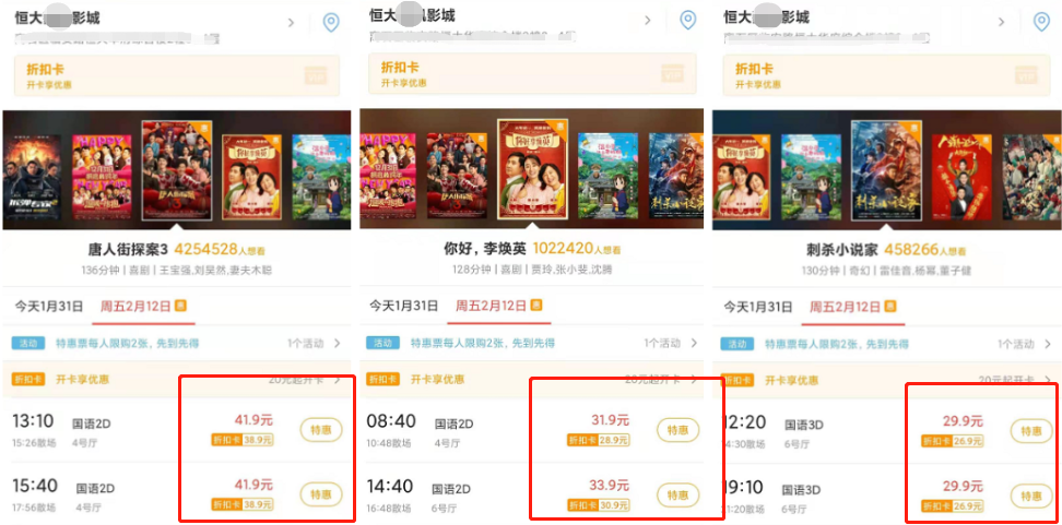 拿某四线城市来说,恒大影城《唐探3》的票价高达41.9元,而《你好,李焕英》票价31.9元,IMAX3D的《刺杀小说家》票价更是只有29.9元,如此票价差距着实让影迷有些心寒,既不是3D也不是啥特效大片这个票价是真的太高了。