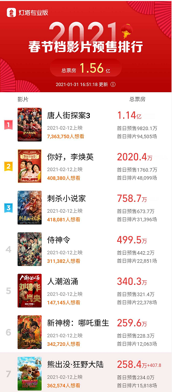 截至1月31日,综合淘票票和猫眼数据,万达电影出品的《唐人街探案3》凭借前作优秀的口碑,想看人数累积超过1162万人,远超其他影片。北京文化出品的喜剧电影《你好,李焕英》想看人数达142万人;华谊兄弟参与出品的《侍神令》想看人数81万人;华策影视主控的奇幻动作电影《刺杀小说家》想看人数达到87.6万人;华强方特出品的IP系列动画电影《熊出没·狂野大陆》想看人数73万人;光线传媒参与出品的喜剧犯罪电影《人潮汹涌》想看人数34万人。