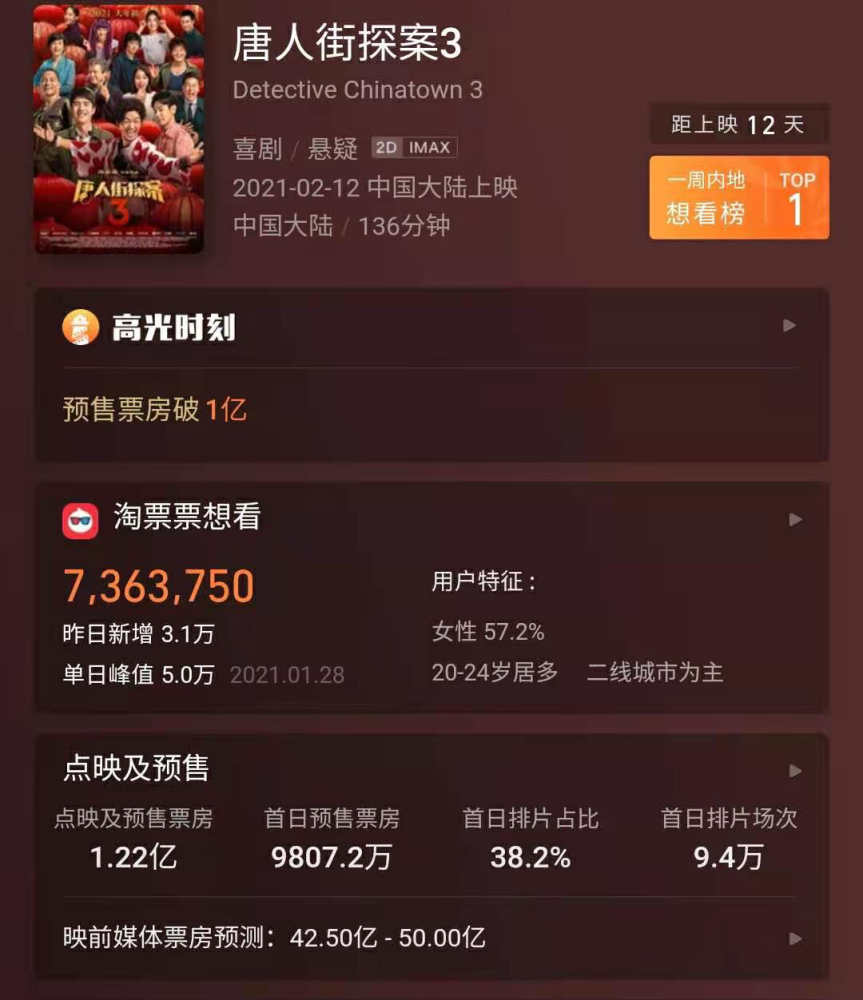 《唐人街探案3》(简称《唐探3》)成为春节档大热门,仅36小时预售总票房破1亿。截至1月31日晚发稿前,预售票房已达1.14亿元,领跑2021年春节档预售大盘。媒体预测该片票房上限高达50亿元。据悉,《唐探3》成本在5亿元左右,若实现上述预期,出品方万达电影则获益匪浅。