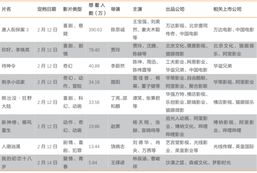 包括万达电影、华谊兄弟在内共有8家A股影视公司参与春节档,春节档表现能否为各家公司带来事迹“开门红”将受到市场关注。