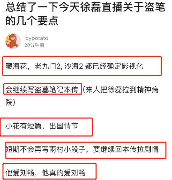 除此以外,徐磊提到,会写解雨臣的短篇,将解雨臣这小我物设定完善起来,但是也禁不住让人怀疑,这其中会不会埋入大量黑花线,为黑花打补丁。