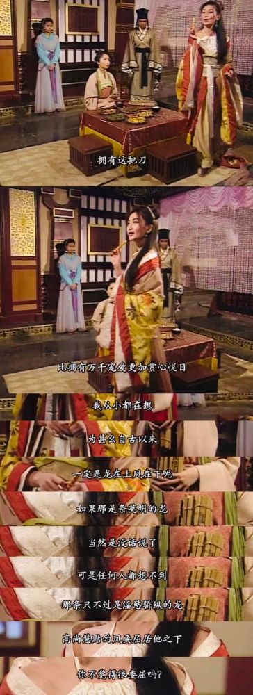 这一版的妲己之所以令人难忘,除了温碧霞恰如其分的媚,还有妲己身上鲜明的女权主义色彩。妲己从小被西伯侯预言是亡国祸水,老爹不让她读书识字学习先进文化,看到工人雕刻柱子,第一时间想到的是“为何必然是龙在上,凤在下?”,(虽然凤也是雄性)完全是潜意识里的反叛精神。