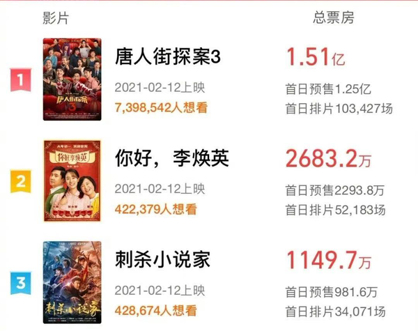 光光是预售票房就已经超过1.5亿,那就意味着《唐探3》的总体票房不会太差,只但是春节档上映的影片数量太多,都等着分春节档这块大蛋糕,《唐探3》即便预售成绩再好,市场份额依旧会被瓜分。