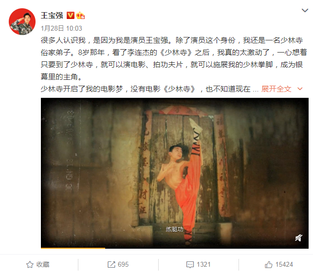 在这部电影中,王宝强将颠覆以往“喜剧演员”的既有印象,化身正统少林武僧,展示拳拳到肉扎实的武术功底。对于这部电影上映,王宝强是十分感慨的。1月28日,他在微博上表示,为了这部电影“拼搏三十年,终圆儿时梦”。
