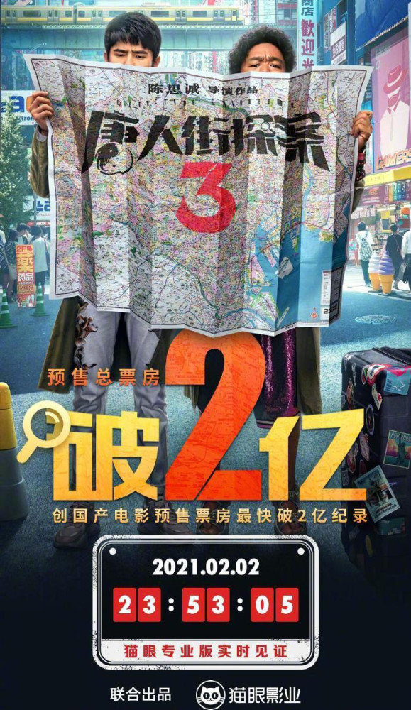 由陈思诚导演,王宝强、刘昊然等主演的悬疑推理喜剧片正在进行紧锣密鼓的宣传。据猫眼数据显示,截至到2月2日23点53分,《唐探3》预售总票房就突破2亿,创造国产电影预售最快破2亿纪录。
