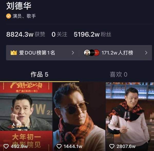 虽然刘天王的人气这么高,但是业内人士也分析说他现在的奇迹压力很大。这次他开通账号拍摄小视频也是为了给自己的新电影增加热度和流量,尽管他这几年拍摄的电影口碑和票房还是很不错的,从2017年的《追龙》再到2019年的《扫毒2》票房成绩都很棒,在今年疫情期间上映的《拆弹专家2》目前票房也已经突破12亿。