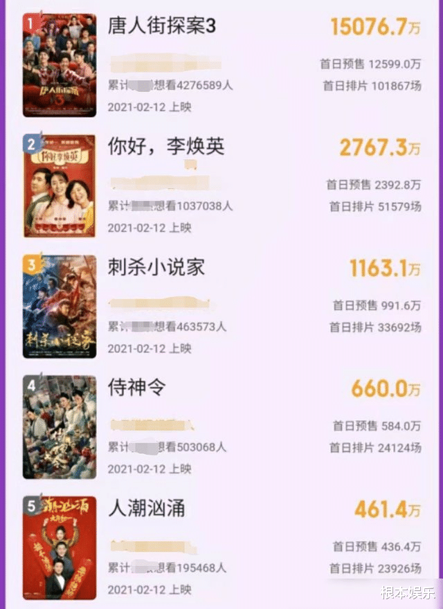 就目前春节档预售票房,刘德华《人潮汹涌》排名第五位,预售票房为461.4万,远远低于前面四位,与其高质量的5000万粉丝不相符,这就是所谓的“人气高不等于票房高”