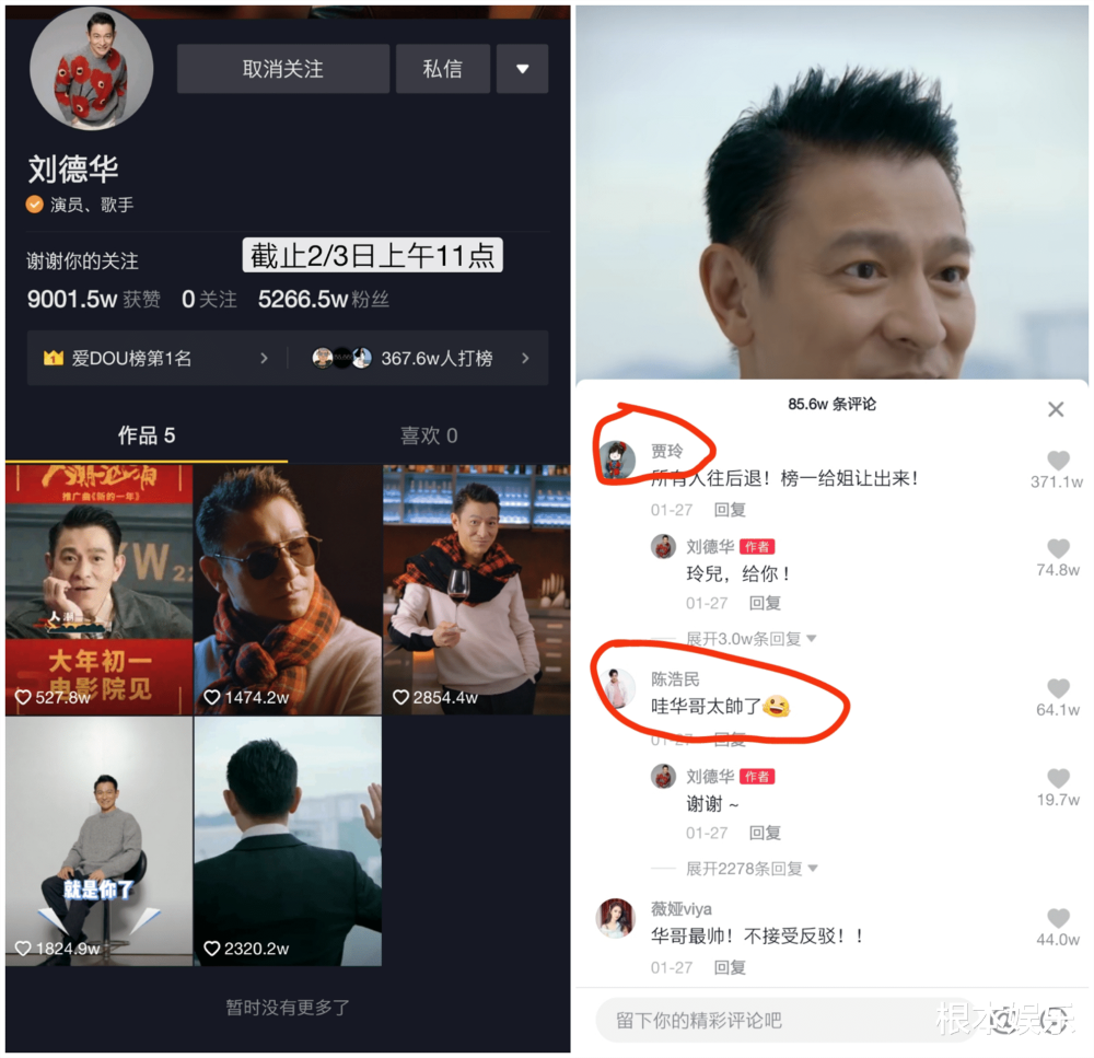 2021年开端娱乐大事务,必属刘德华于1月27日开通全球首个社交账号douyin,一夜之间吸粉2000万人,5条静态平均点赞超过1000万。截止2月3日上午11点,刘德华粉丝5266.5万,超过了邓紫棋(4163.2万)+陈奕迅(688万)+郭富城(205万)的总和,人气实在高