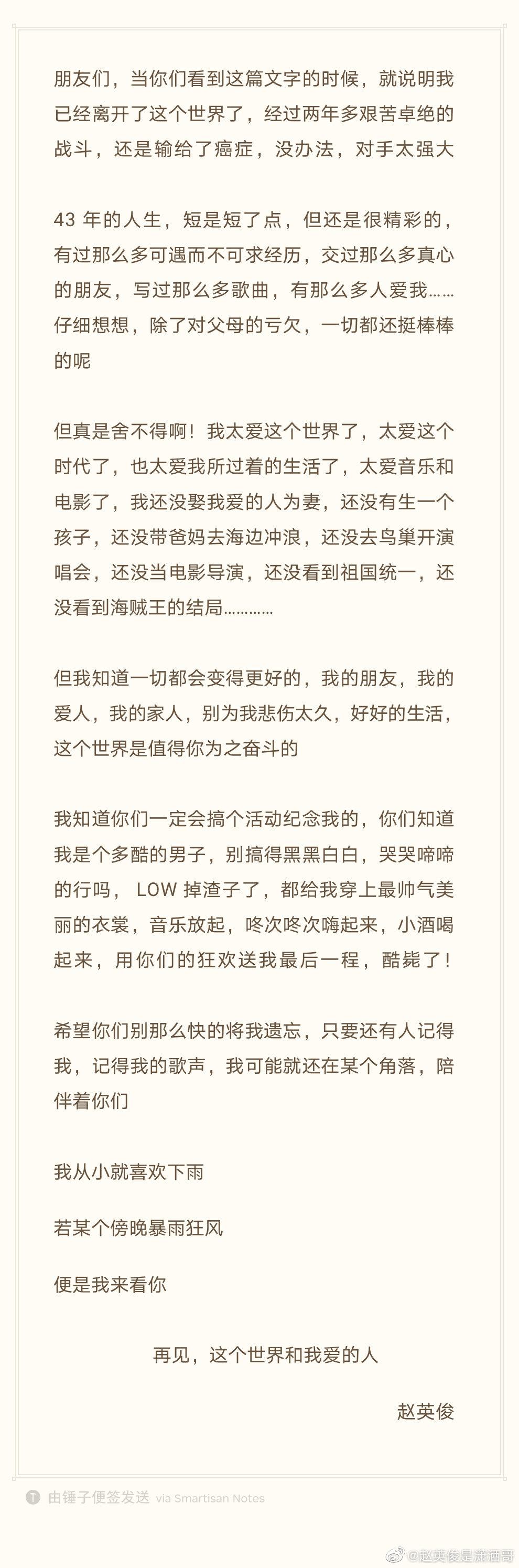 就在刚刚,这首歌的作者,赵英俊先生因病去世,享年43岁。据说是因为肝癌,心痛之余,万千感慨,希望你在另一个平行时空,继续潇洒……