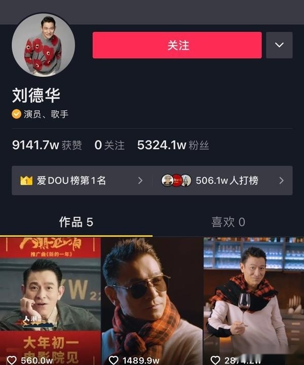有了如此的诚意,这才让刘天王成功开通了账号,从而产生了巨大的流量效益。因而可知,虽然目前娱乐圈有很多流量小生,但天王的价值仍旧是让人眼红。甚至有新闻报道,称该视频平台还想要吸引 王菲 开通账号,据说给出的价格比刘天王还要高,大约是一亿二千万钱。 但是目前王菲还没有考虑好,说不定未来她也会正式开通,从而发一些短视频。在开通了账号以后,刘德华一共发布了5个视频,就已经差不多拥有了五千多万的粉丝,并且还是爱豆榜的第一位!他的视频内容也是比较简单的,但是最高一条已经收获了两千多万的点赞量,很多明星也是纷纷艾特他,并且在评论区进行留言和应援。