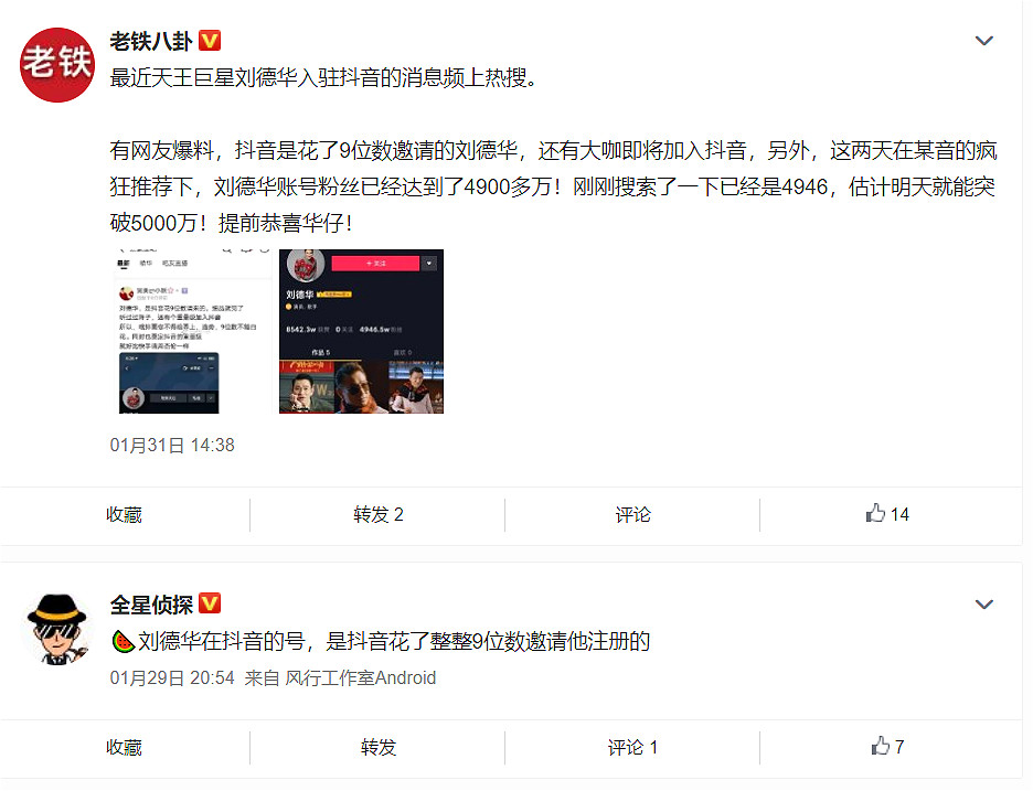 与此同时一些“内部消息”也得以“走漏”,有人说刘德华是抖音花重金邀请入驻的,目的是对抗某对手平台,金额高达9位数!