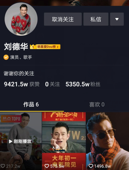 刘德华入驻DY已经不是甚么新鲜事了,短短的两天时间就圈粉四千多万,这样的数据足以证明他的实力有多劲爆,同时期入驻该平台的那英、王宝强、陈伟霆,都只拿到了几十万,一百多万的可怜数据!