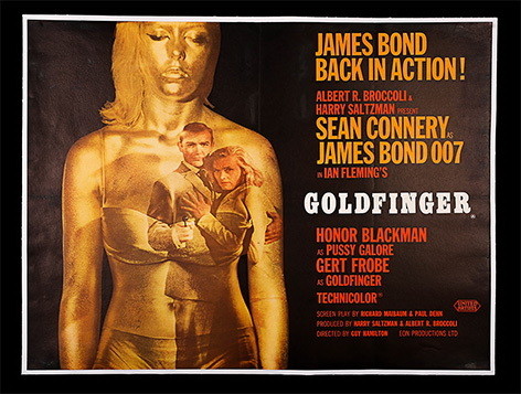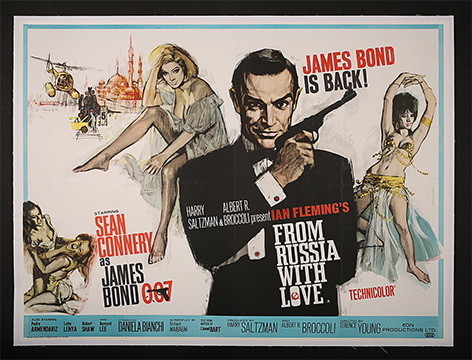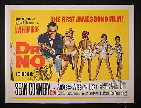 1962,米切尔·胡克斯为邦德系列第一部作品《诺博士》设计海报,除了旗帜鲜明地宣告这是“第一部邦德电影”,海报凸显了这部动作惊险片的情色意味——片中四位和邦德分别有过交集的女性角色,在“lady's man”肖恩·康纳利身旁被依次罗列,占据了海报三分之二的空间,大反派“诺博士”仅仅在海报的边角显出半个身位。1963年第二部邦德电影《来自俄罗斯的爱情》(From Russia With Love)和1964年《金手指》(Goldfinger)的海报,一个色调偏冷(使人联想到苏联广袤的冰原)、一个色调金黄,都将邦德和邦女郎间的爱欲纠葛作为主题,反派的形象则被安排在海报的边边角角,或干脆隐匿在黑色部分中。