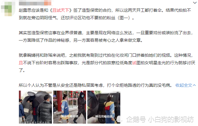 之前网上关于赵露思拍戏的路透大家应该是看过不少的。每次她出镜都是大大方方,也没有人遮掩,足以说明她本人并不是怕被拍到。问题就在于要是偶然遇到,拍两张照片还能说是挺新奇的。可去年她出演的《国子监来了女弟子》有大量的路透传出,她在剧里使用的造型基本上都被曝光了。剧组的工作人员都想撞墙了,一部剧还没播,大家就把造型看得差不多了,对观众来说还有什么吸引力。为了保持神秘性,到时候把涉及到的片段之间删减都是有可能的。