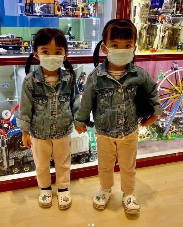 再看他们的双胞胎女儿,身为异卵双胞胎的小姐俩一个像爸爸,一个像妈妈,真的是太会长了。