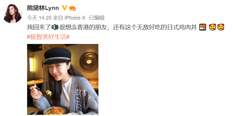 2月9日,熊黛林在小我社交平台晒出一张老公郭可颂视角照片,并配文写到:“我回来了,很想念香港的朋友,还有这个无敌好吃的日式鸡肉丼 ”,尽显好心情。
