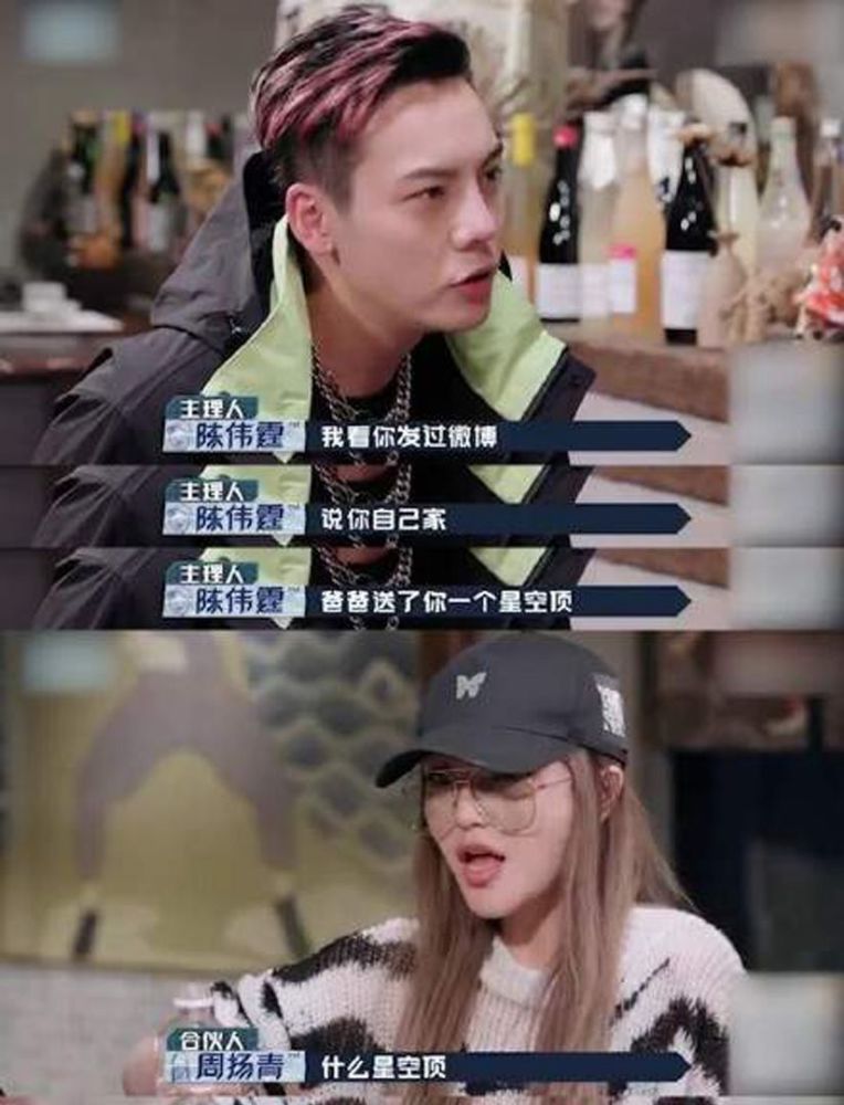 周扬青有钱那也是出了名的,重要的是,她不自知。在《潮流合伙人》中陈伟霆问道:“听说你爸爸送了你一个星空顶”,周扬青一脸很随意的样子,还反问,“你们家没有吗?”我们家当然没有了,并不是每小我都出生在周扬青这样的家庭中,从出生起就输在起跑线了。