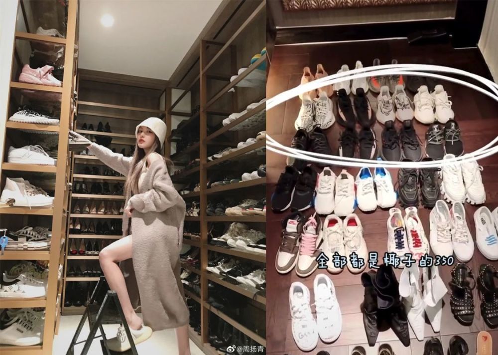 其次是周扬青身为品牌主办人,服饰、鞋子和包包当然少不了。之前她就晒出过自己的衣帽间,单独摆放鞋子的地方,就占了足足3面墙,9层高的空间。而且她的鞋子也不单单是普通的运动鞋,许多千元、上万元的球鞋都是放在角落里落灰。