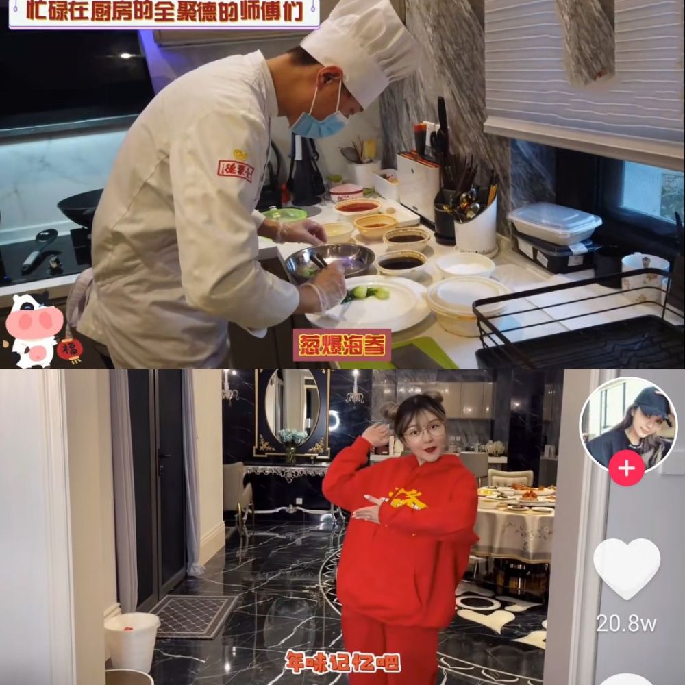 因姥爷爱吃全聚德,周扬青特地请全聚德的师傅来家里私人定制。做的过程当中,镜头移向大厨,也无意间曝光厨房内景,厨房大到能够容纳三小我做菜,配料齐全,简约大气的装修透露着一股有钱的味道。