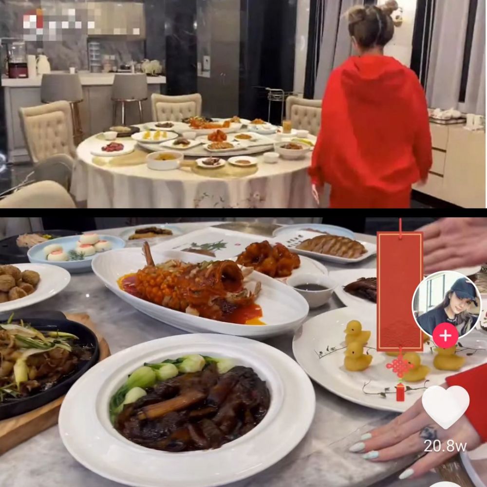 其中有葱爆海参、松香桂鱼、鱼香虾球、炙子烤肉等等,不愧是有钱人家的年夜饭,周扬青这vlog也算是最低调的炫富了,一般人真比不了。