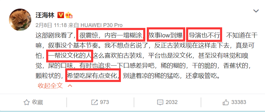 不光如此,他一天发两条微博,其中还抵制了导演,抵制了编剧。还说此部剧能够上星,完全是因为关系的原因。