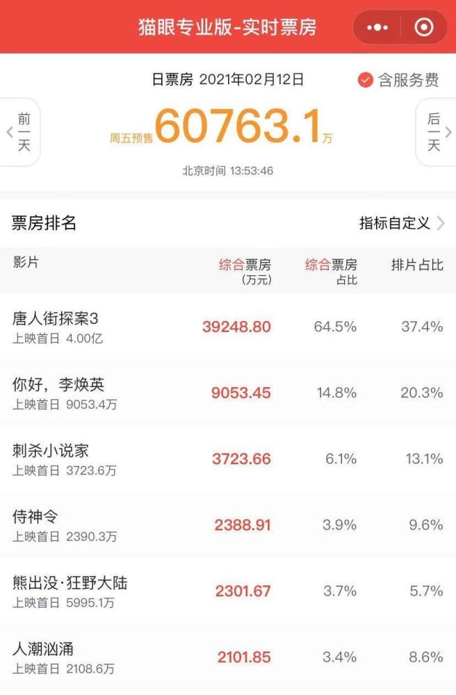 截止发稿,《唐探3》首日预售票房已经突破4亿,排片率也达到了37.4%,除了大年初一当天预售票房比较高以外,初二初三的预售票房加起来了不少,如果算上这两天的预售票房,《唐探3》目前的总预售成绩可以达到5.4亿!