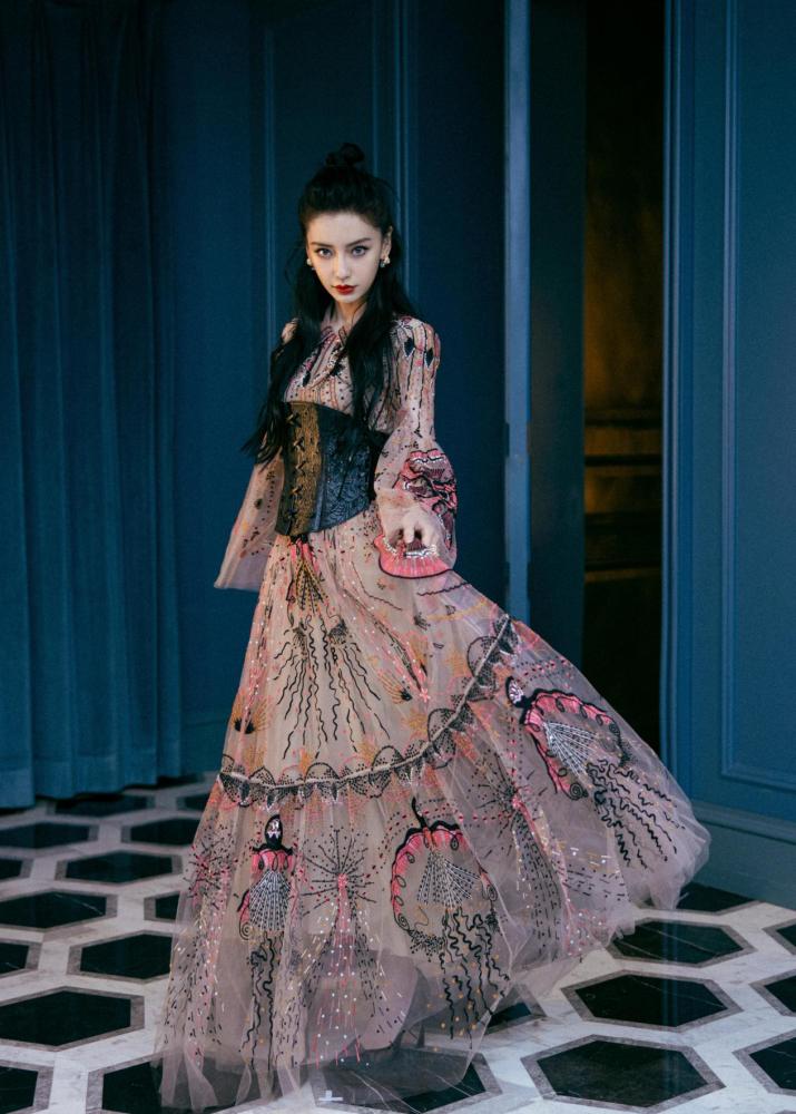 本身就是模特出道,加上混血颜,baby在大片的拍摄上可谓是相当有一手了。酷飒的眼神和精致的妆容,让复古华丽的长裙也变得更有高级韵味。存在感极强的腰封也是一大亮点,华丽的造型一下就变得更高级耐看了。非常有杂志大片的既视感,镜头表现力着实有够强。