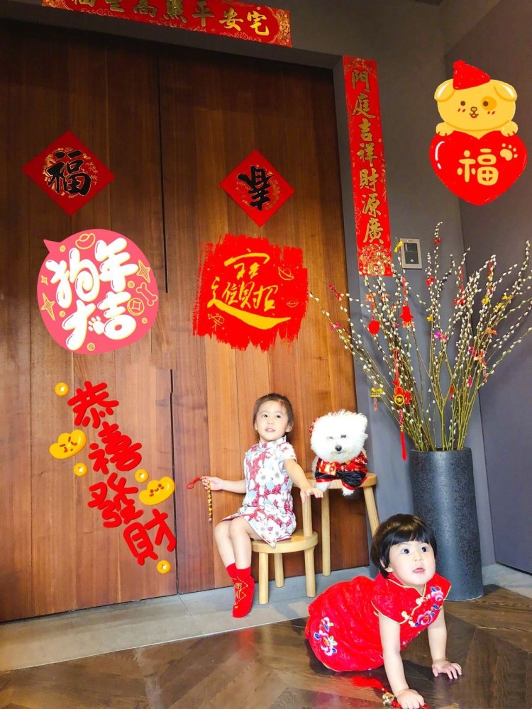 贾静雯每年都会让女儿们站在这两扇门面前拍摄,记录下她们的成长。下图是2018年时候拍的,波妞才不到一岁,穿着旗袍秀出肉乎乎的手臂和大腿可爱至极。