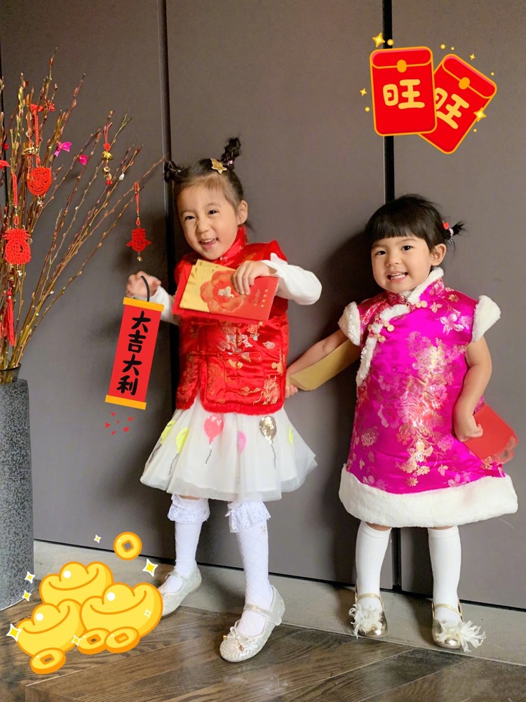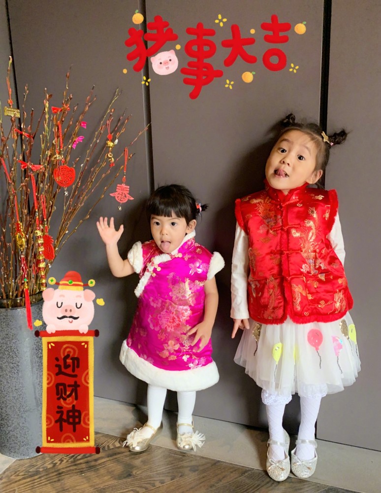 2019年春节,快要两岁的波妞长势喜人,姐妹俩手持红包,或是笑得合不拢嘴,或是吐舌卖萌,画面非常喜庆。每年拍一张这样的照片是贾静雯家的传统,希望能一向延续下去。